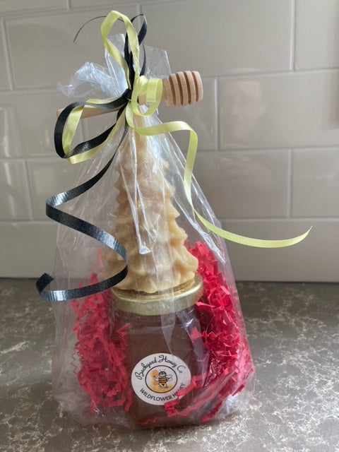 These sweet gifts will put a smile on someone's face! Pick your favourite candle and either Liquid Wildflower Honey or a 4 piece box of our delicious Honey Caramels. Tied with a little Honey Dipper.